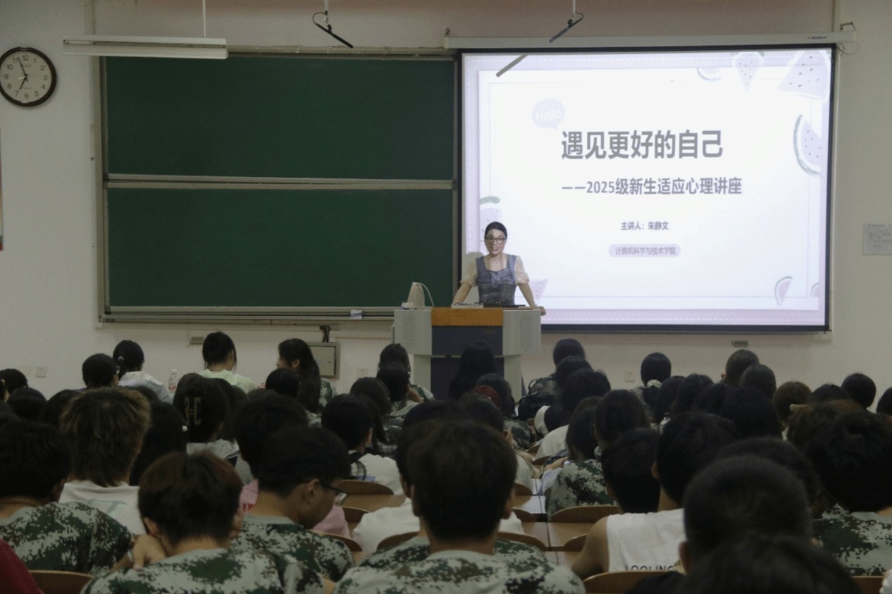 9月10日晚,朱静文老师在理工西阶103教室对新生进行了大学适应性教育。她以“遇见更好的自己”为主题,从心理方面展开,告诉同学们进入大学之后要在哪些方面做出改变,尤其指出了大学期间在时间管理、课程学习、人际关系等方面与高中时期的不同。随后,朱静文以“认识自我”为切入点,引导新生寻找归属、实现自我悦纳。最后,朱静文提醒同学们要为自己制定一个合适的目标,并在对目标的不断追寻中逐渐实现自我价值。