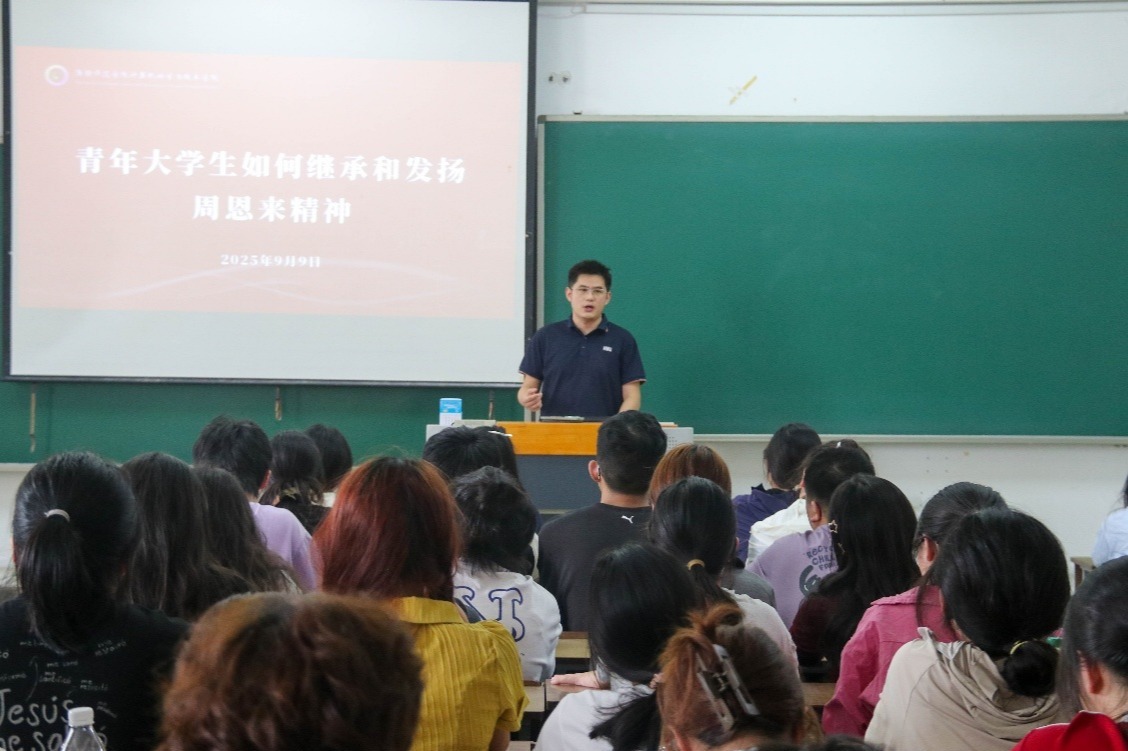 王勇胜老师在讲座中向新生讲解了“周恩来崇高精神风范”的详细内涵,希望同学们能够在未来的学习生活中以周总理为楷模,将其精神融入学习生活,树立远大理想、担当时代使命。同时,王勇胜结合计算机专业特色,引导同学们思考如何在实际行动中传承周恩来的崇高精神风范,并鼓励同学们以周恩来崇高精神风范为指引,在学习生活中不断提升自我,努力成为有理想、敢担当、能吃苦、肯奋斗的新时代好青年。