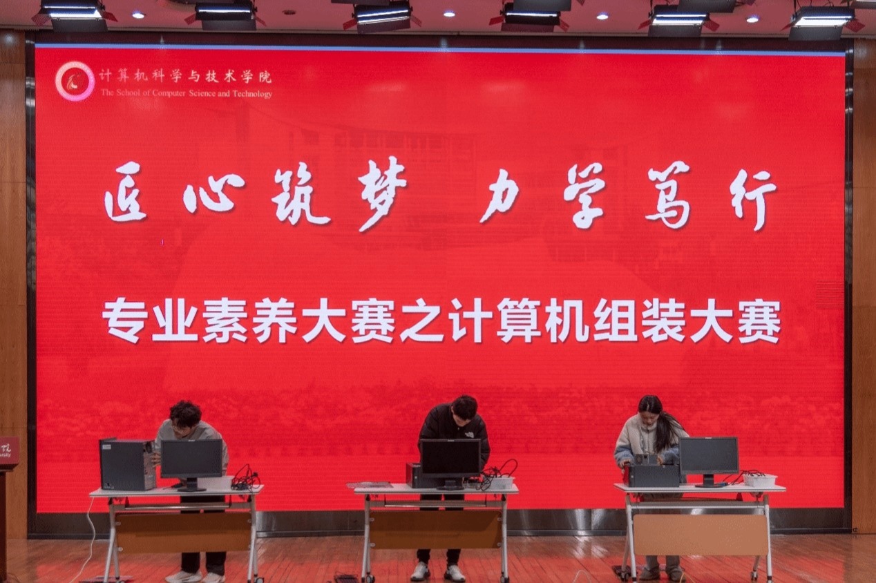 随后,一场紧张激烈的计算机组装大赛拉开了专业素养大赛的序幕。晁毓奇、赵雅婷和何振龙三位同学在主席台上展现了他们娴熟的计算机组装技术。他们充分发挥平时所学,时而手持螺丝刀,时而触摸各种硬件,力争在最短的时间内把眼前的主机重组。经过激烈的角逐,最终何振龙同学率先完成了计算机重组,获得了第一名。