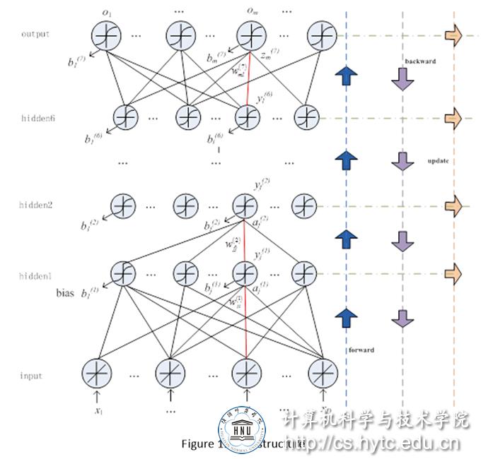 DNN包括8层用于这个测试,包括一个输入层,六个隐藏层,和一个输出层。详细的网络结构如图1所示。该算法包括三个主要部分:计算,误差反向传播,和重量更新。