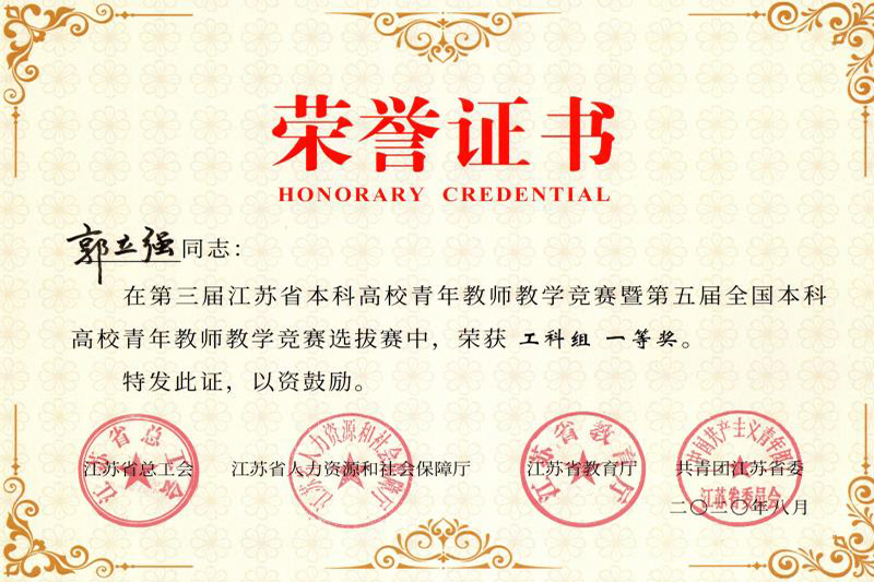 8月21日至23日,第三届江苏省本科高校青年教师教学竞赛暨第五届全国本科高校青年教师教学竞赛选拔赛在南京大学举行。计科公司郭立强老师荣获工科组一等奖。郭立强老师还被江苏省总工会授予“江苏省五一创新能手”荣誉称号,被江苏省人力资源和社会保障厅授予“江苏省技术能手”称号。