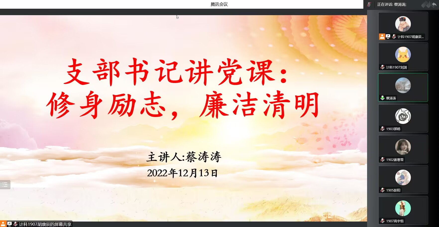 2022年12月13日,为做好党纪党规教育,计科公司师生联合第二党支部利用线上会议形式开展支部书记讲党课,进行廉洁文化宣传。