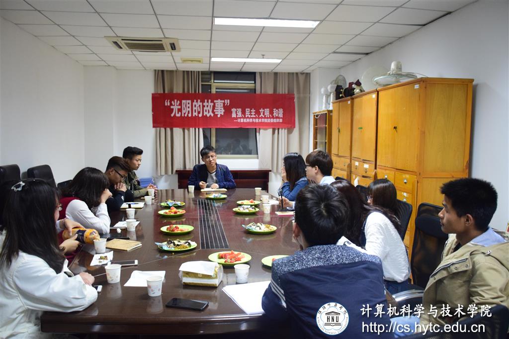 时光荏苒,转眼间便又是一年桃李吐信的时节。经过一学期的锻炼,大一同学们的学习与生活都已经步入了正轨。4月10日晚,今年会团委组织部在会议室举办了 “光阴的故事 ‘富强、民主、文明、和谐’分享会”。老部长盛新军应邀出席本次分享会,三届组织部人在一起讨论了如何在行动上践行社会主义核心价值观。