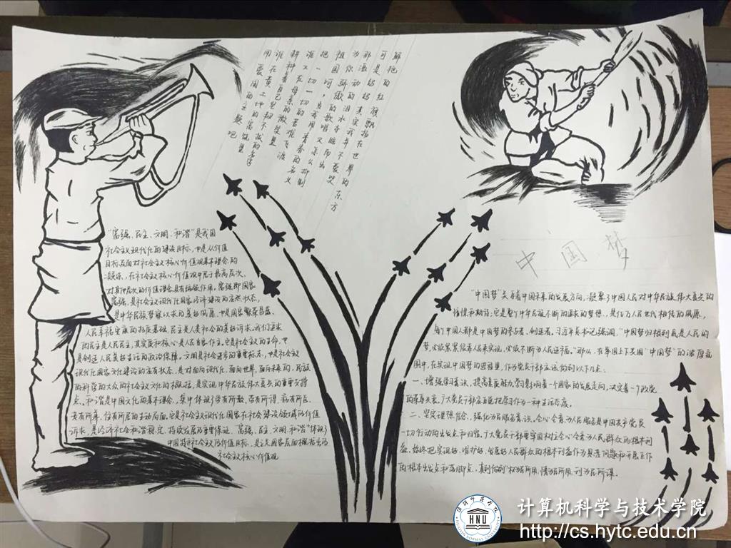 此次比赛分为漫画手抄报和征文两个部分。洁白宣纸上一个个手绘的美丽图案,一个个独出心裁的“富强、民主、文明、和谐”字体,无不彰显制作者对它的用心之深。没有专业的指导,没有ps的高端处理,但每一幅画都拥有着震撼人心的力量。1401班朱培培和1402班傅伟赢得了属于他们的荣耀,获得了此次手抄报漫画比赛的一等奖。