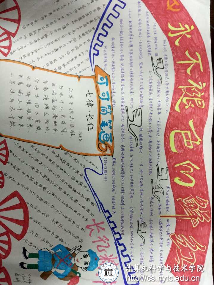 活动,精心策划。学子,踊跃参与。“漫漫征途”作品既寸典雅抒情,又不缺激情澎湃。钱正琪同学的《“长征”到“长征精神”》文学创作,深深表露出红色长征的艰苦,革命道路的曲折。文字传递真情,手报展示热血。管琳娜同学,以厚重的笔墨勾勒出“中华魂”三个大字,用鲜红画出飘扬的五星红旗。红与黑交织,是红色长征的不断追求。还有那绵延的长城,昂扬的战士。