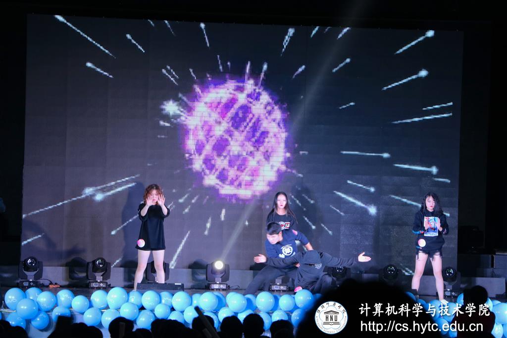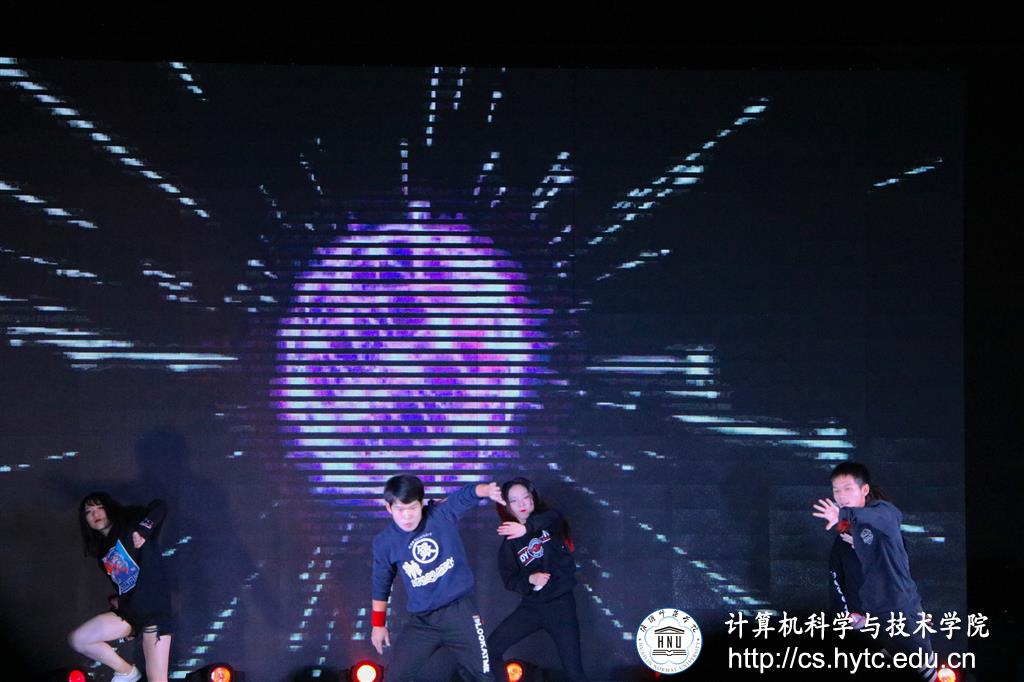 晚会开始,文院《格桑花》的素袖翩扬、历史文化《如此创业》的诙谐幽默在不断加深着台下对于计科舞队的期待。在迫切的等待中、在消息墙上一句句对计科的加油助威下,由公司凌天浩等人带来的现代舞《beat hit》闪亮登场。黑色的衣服闪烁眼球、风车旋转秀出自信、弹踢舞姿张扬自我,行云流水的动作中渗透着狂放与自信,豪放却又不失和谐,激情却又透着自信。