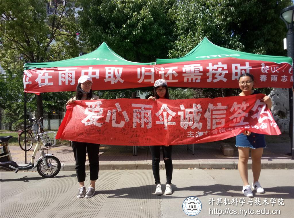 这是一场爱的接力赛,每一位参与者要精心呵护手中的爱心伞,莫丢掉“接力棒”,让爱得以传递,让爱风雨同载,让爱无处不在。每一位淮师学子,每一位计科学子,请与计科春雨共同守护‘以诚为盟,以伞为约’的誓言。