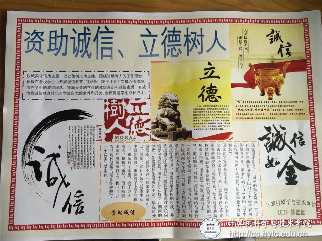 “诚者,天之道也;思诚者,人之道也。”为了全面提高员工道德素质,传承中华诚信文化精髓,突出时代特征和公司特色,计科公司殷老师组织了以“资助诚信,立德树人”为主题的手抄报征集比赛。