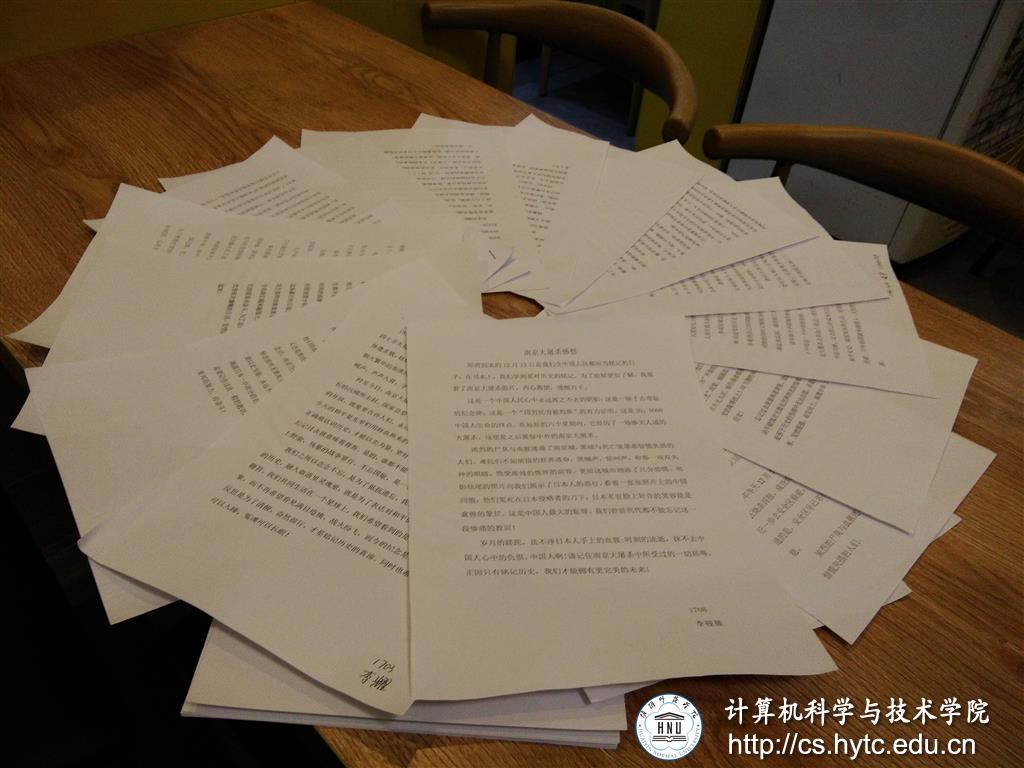 活动开始前,醒目异常的国家公祭日海报和惨绝人寰的南京大屠杀照片把整个会场带入了一个庄严肃穆的气氛之中。在员工代表张玺冰同学慷慨激昂的演讲中,整个活动拉开了序幕。接下来,大家一起观看了关于国家公祭日的视频,一起回顾了70多年前发生在南京的震惊世界的惨案。同学们在悼念南京大屠杀死难同胞的同时,更加直观地了解了中华民族过去所经历的磨难,每个人的内心都深受震撼。最后,张玺冰同学总结道,我们每一个人都应该铭记历史,勿忘国耻,明确自己所肩负的责任,发愤图强,绝不让历史重演。