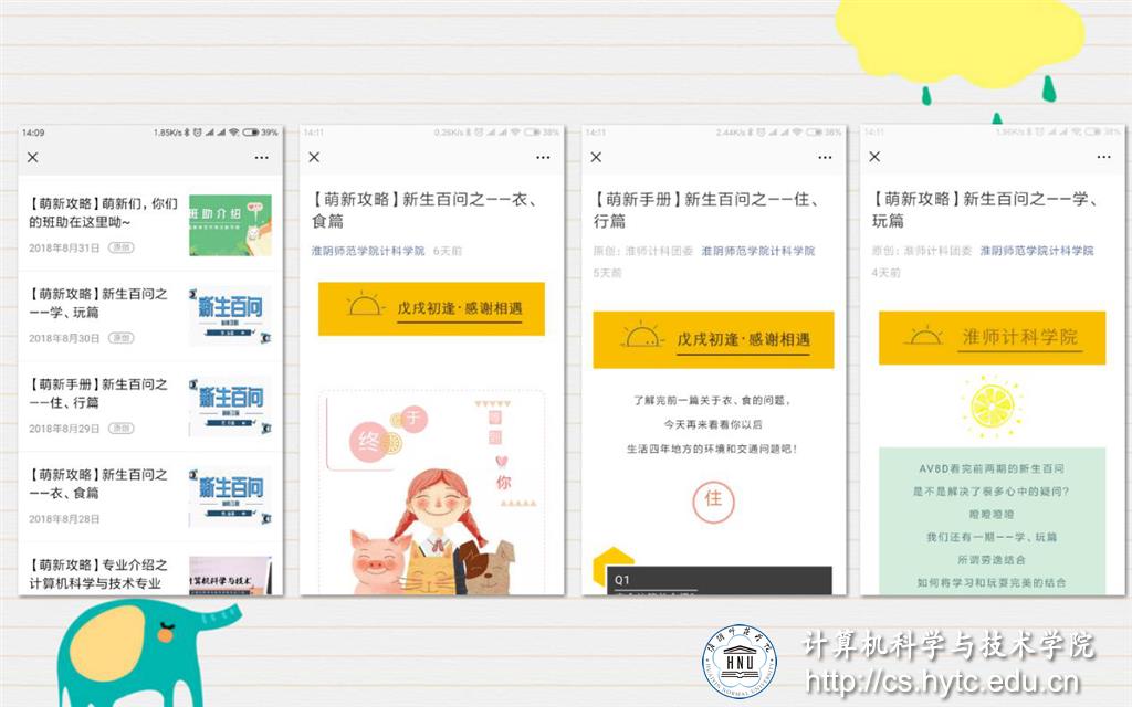 今年的八月底到九月初,计科公司微信公众平台相继推送了系列栏目“萌新手册”,帮助新生提前了解进入大学必须知道的各项事宜。“萌新手册”每天都坚持为新生解答一项疑惑,包括入学准备、报到须知,在淮师的衣食住行,以及学习玩乐等方面。这些推送使那些对老员工活还处在憧憬和迷茫中的新生对淮师有了一个初步的认识,为他们进入大学顺利的报到和入住学习做好了准备。