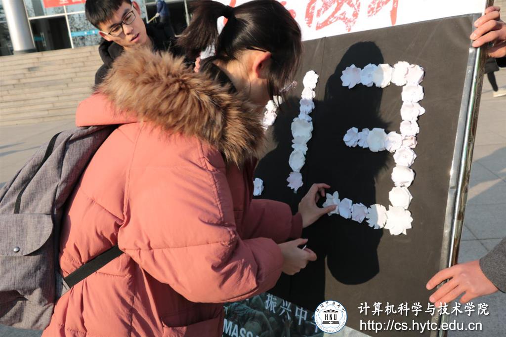 随后,同学们在理工楼前亲手制作小白花悼念遇难同胞。制作完成之后,同学们把小白花贴在一起,汇成了1213的字样,深切表达了同学们对牺牲烈士的尊敬和怀念。此外,大家还拉起了“永铭国耻,振兴中华”的横幅,并在横幅上签名,以寄托哀思。