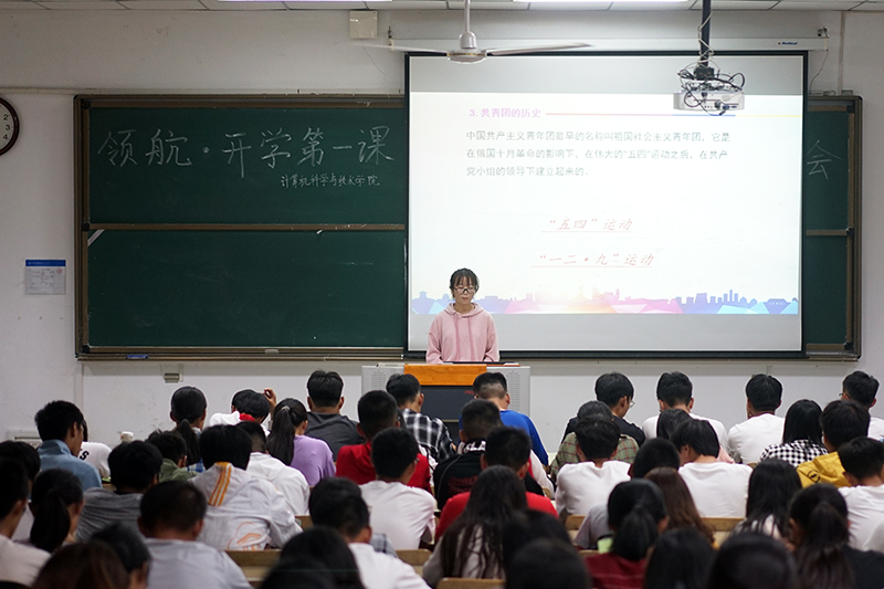 为进一步加强19级新生团员对共青团的认同感和归属感,进一步增强团员意识,引导全院团员坚定永远听党话、跟党走的理想信念,9月25日晚,计科公司在崇文阶104开展“领航·开学第一节团课”主题教育活动。本次团课由公司团委老师曾佳慧主讲,相关员工干部与2019级全体新生参加。