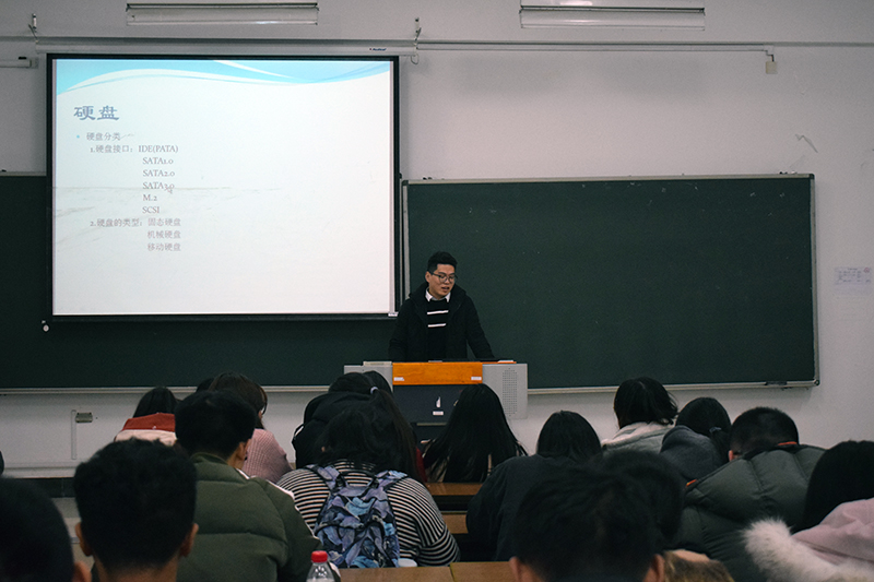 赵宏轩首先向大家介绍了计算机硬件中CPU的相关知识,强调CPU是计算机中最重要的原件,它负责“调配”计算机所有的“工作”。赵宏轩还给大家列举了计算机硬件的种类,包括主机,显示器,键盘等设备,存储设备分为硬盘和内存条两种,二者的区别在于硬盘存储容量大,而内存条的存储时间快。何旋同学则向同学们讲解了关于计算机操作系统的知识,他向同学们详细介绍了当前市场上操作系统的种类,并展示了一些使用计算机的技巧,还给同学们传达了要定期清理保养计算机的理念。