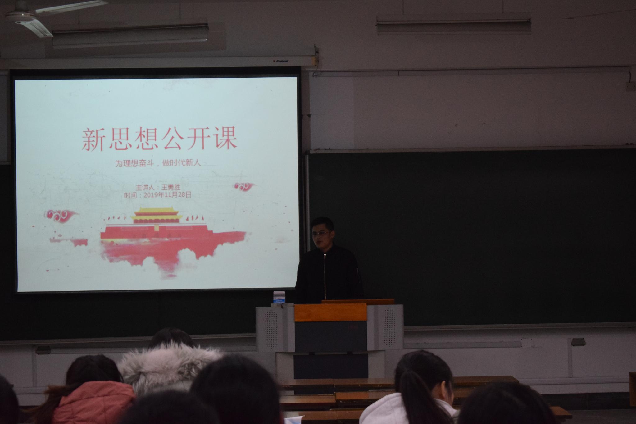 为深入学习习近平新时代中国特色社会主义思想,激发同学们的奋斗热情,11月28日,计科公司于理工南楼209开展了以“为理想奋斗,做时代新人”为主题的新思想公开课。本次公开课由计科公司党员老师王勇胜主讲,计科1805和1806班全体同学参加。
