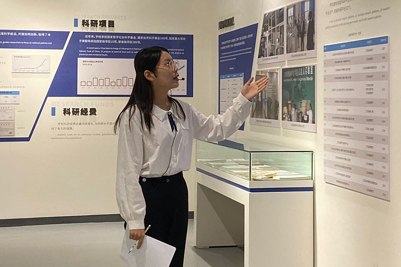 图为解说员钱禹璇讲解校史 记者彭阳摄