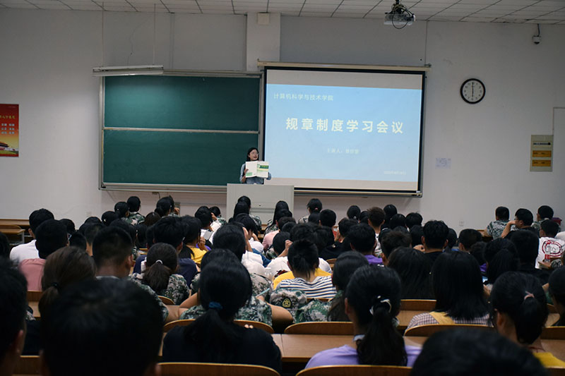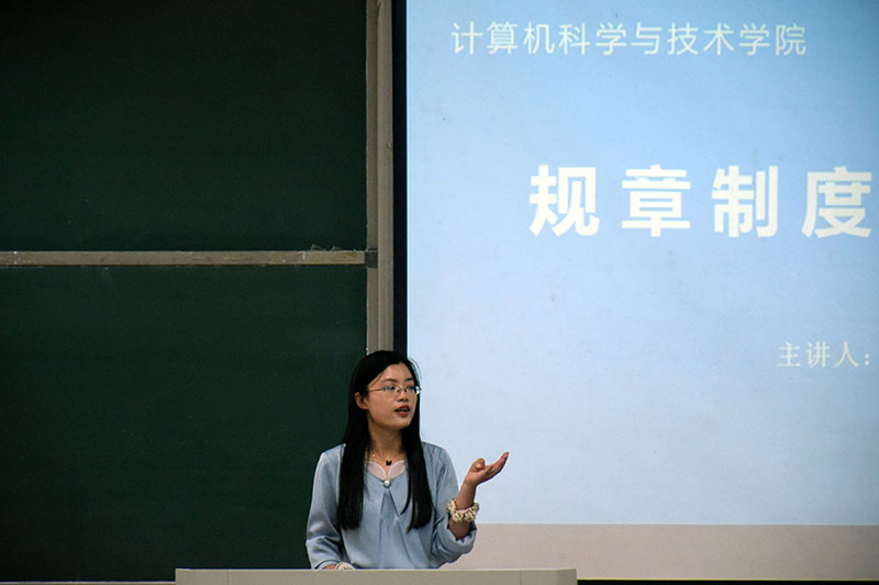 为了帮助新生更好地了解公司的规章制度,强化底线意识,9月18日晚,计科公司于理工楼西阶101和103开展规章制度学习会议。本次会议由计科公司20级辅导员曾佳慧老师主讲,全体新生参与。