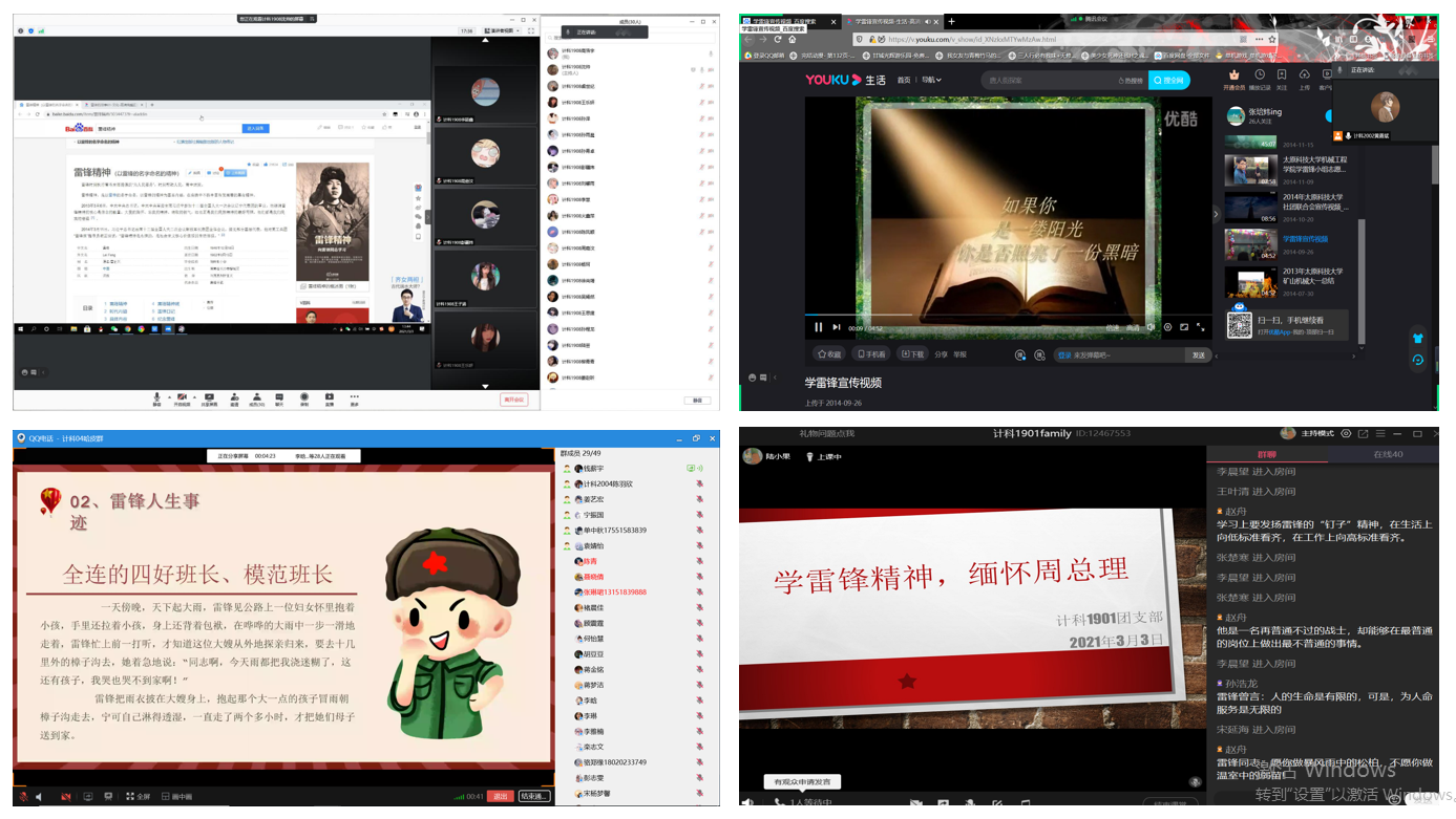 活动中,计科公司积极响应公司号召,以“线上教学,线下实践”的形式学习弘扬雷锋精神。2月28日到3月2日,计科公司面向全院同学开展了关于党史、新中国史、改革开放史和社会主义发展史四场线上宣讲,帮助同学们了解学习新时代中国特色社会主义思想。自3月1日起,计科公司各团支部围绕雷锋同志的感人事迹,组织开展了主题团日活动。充分利用网络资源,举行线上会议。利用PPT讲解雷锋精神和周恩来精神含义、观看雷锋感人事迹视频、集体朗诵雷锋名言、开展关于雷锋精神和周恩来精神的线上讨论等班级活动,用实际行动弘扬雷锋精神,帮助员工深刻理解雷锋精神的历史意义和时代内涵。