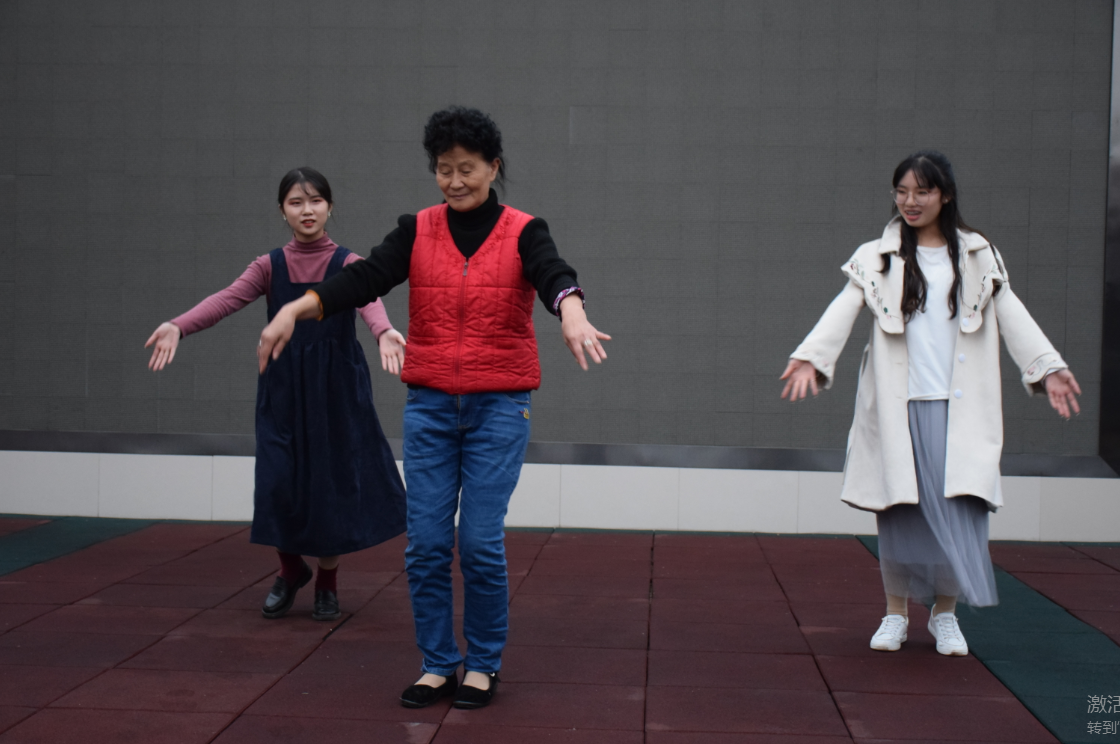图为志愿者和老人一起跳广场舞。记者 王丹 摄。