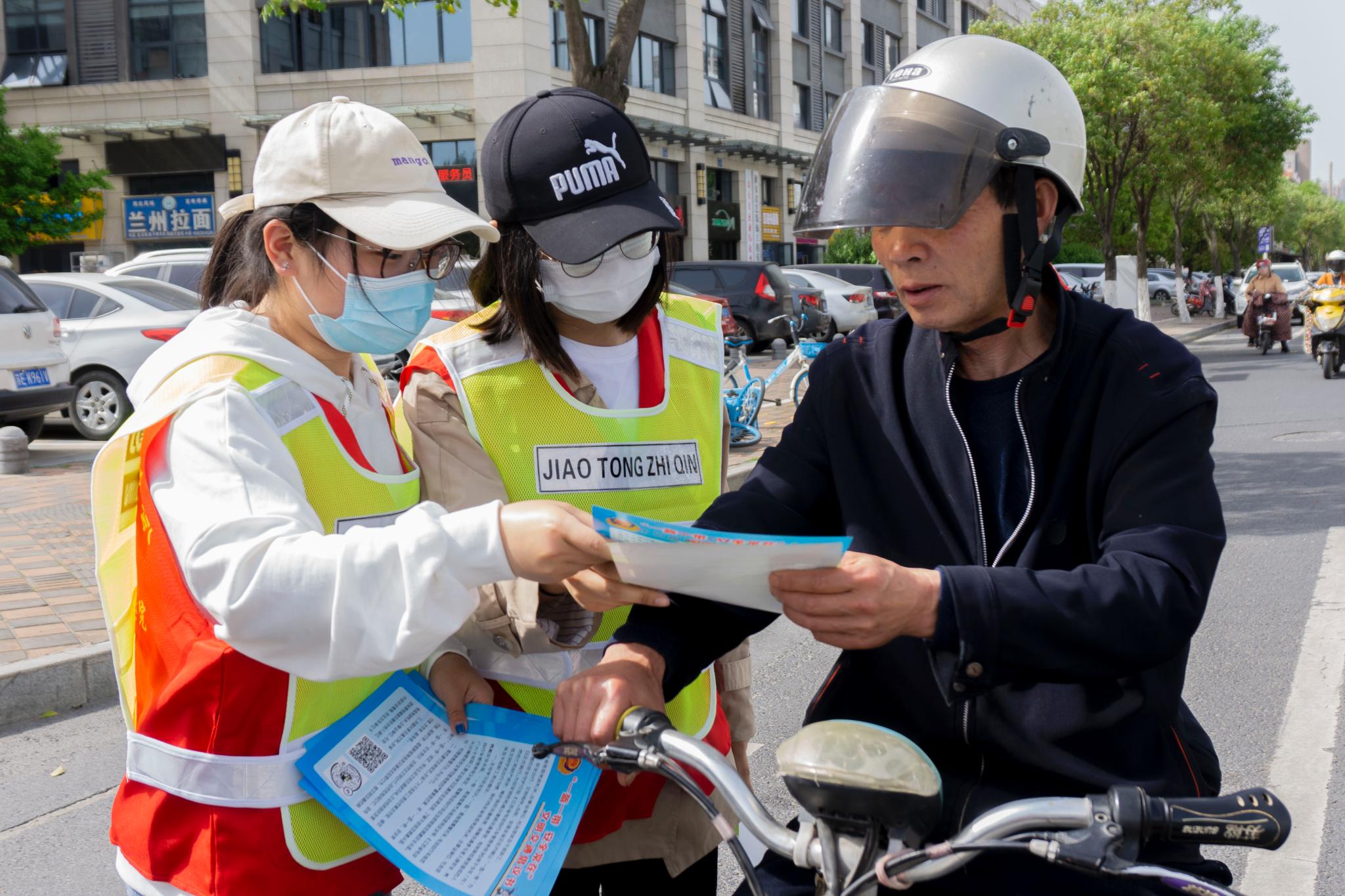 图为志愿者给过路行人发放交通宣传单。记者 马源 摄。