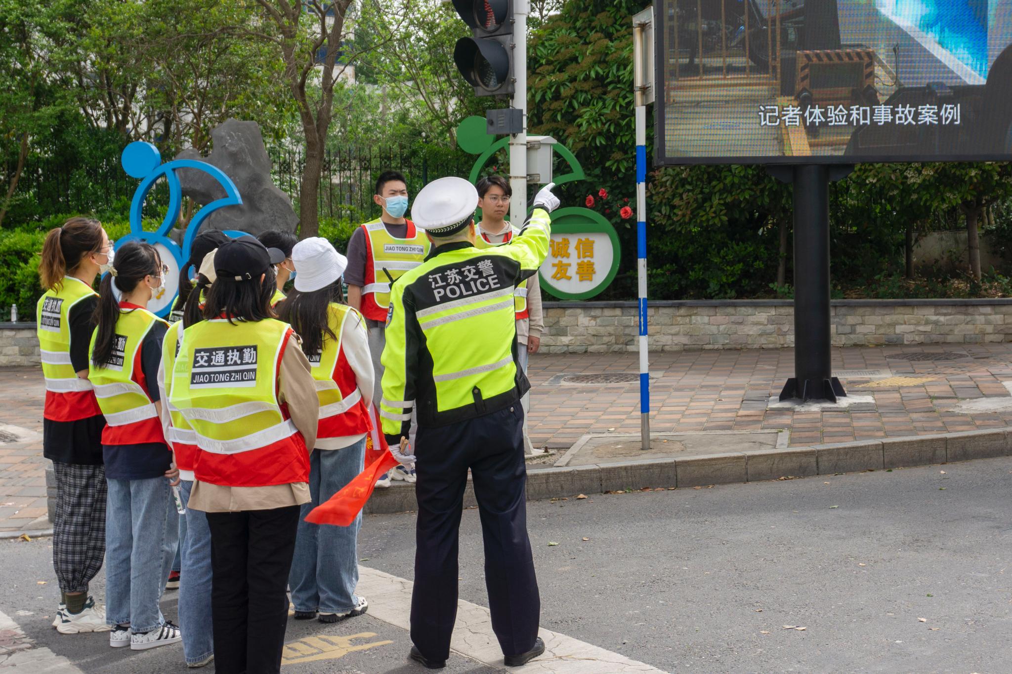 图为志愿者和交警学习指挥交通。记者 张文闯 摄。