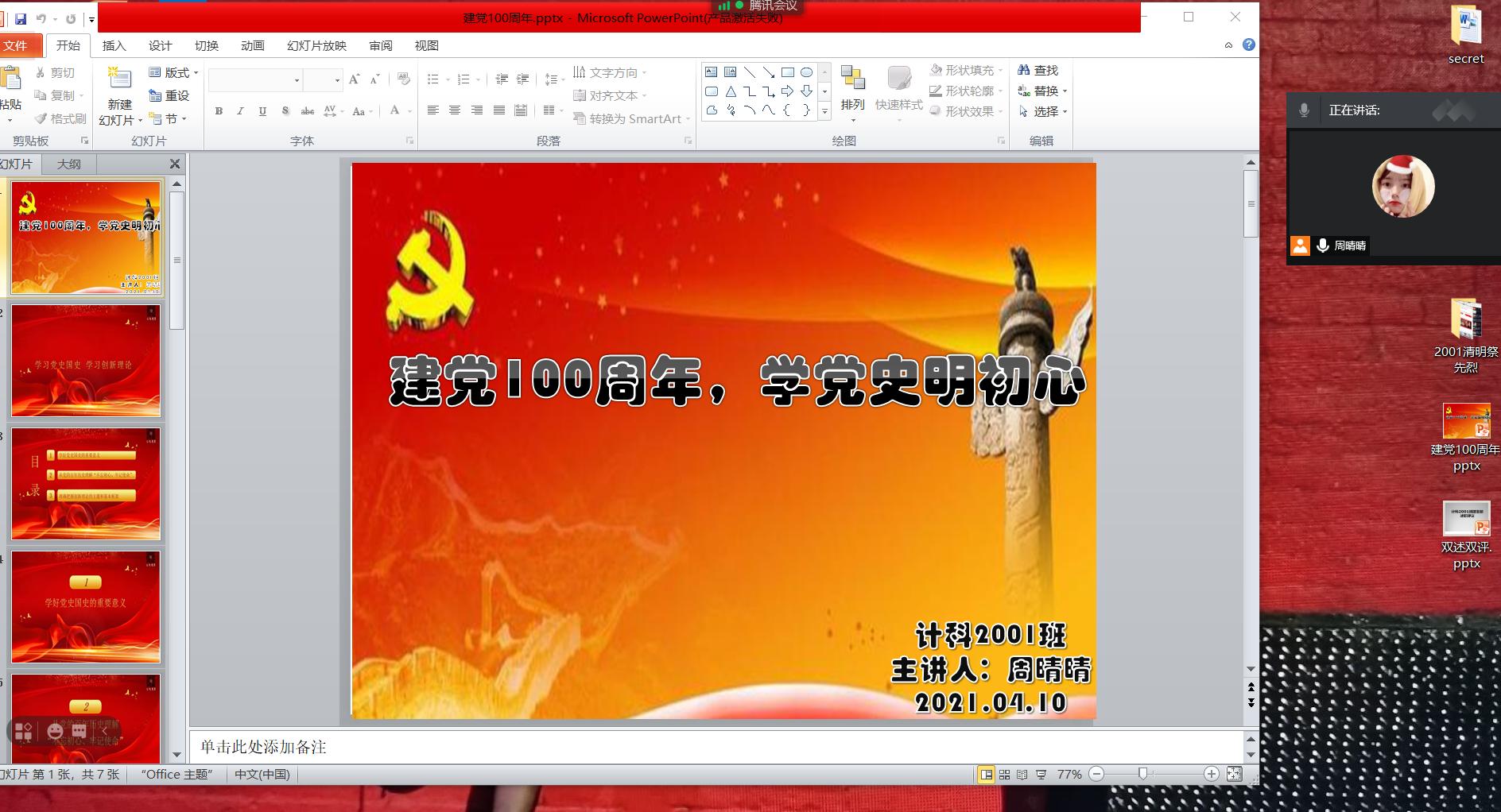 为了大力宣传中国共产党的光荣历史和丰功伟绩,激发同学们的爱国情怀,计科2001团支部在4月10号下午4点开展观视频学党史主题团日活动。这次活动由团支书周晴晴主持,2001班全体成员共同参与。