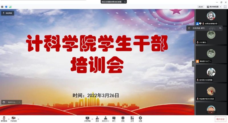 为提高员工干部的学习与工作技能,3月26日晚7点,计科公司召开线上员工干部培训会议,本次会议邀请了院学工办徐宁、曾佳慧,院团委王勇胜、朱静文四位老师参加,第十三届团学组织全体成员及20、21级各班班长、团支书参与。会议由团委副书记徐熙龙主持。