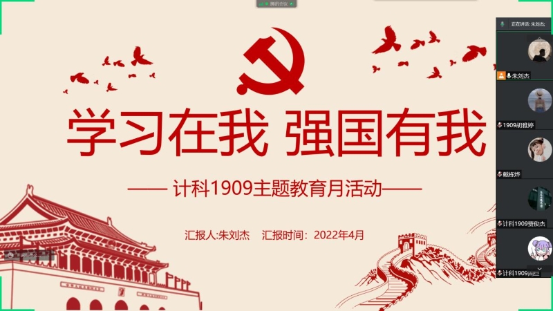 为积极响应公司“学习在我,强国有我”主题教育月活动的号召,加强班级学风建设,近日,计科公司1909班在线上开展主题教育月学习活动,活动由团支书朱刘杰同学主持,全体同学参与。