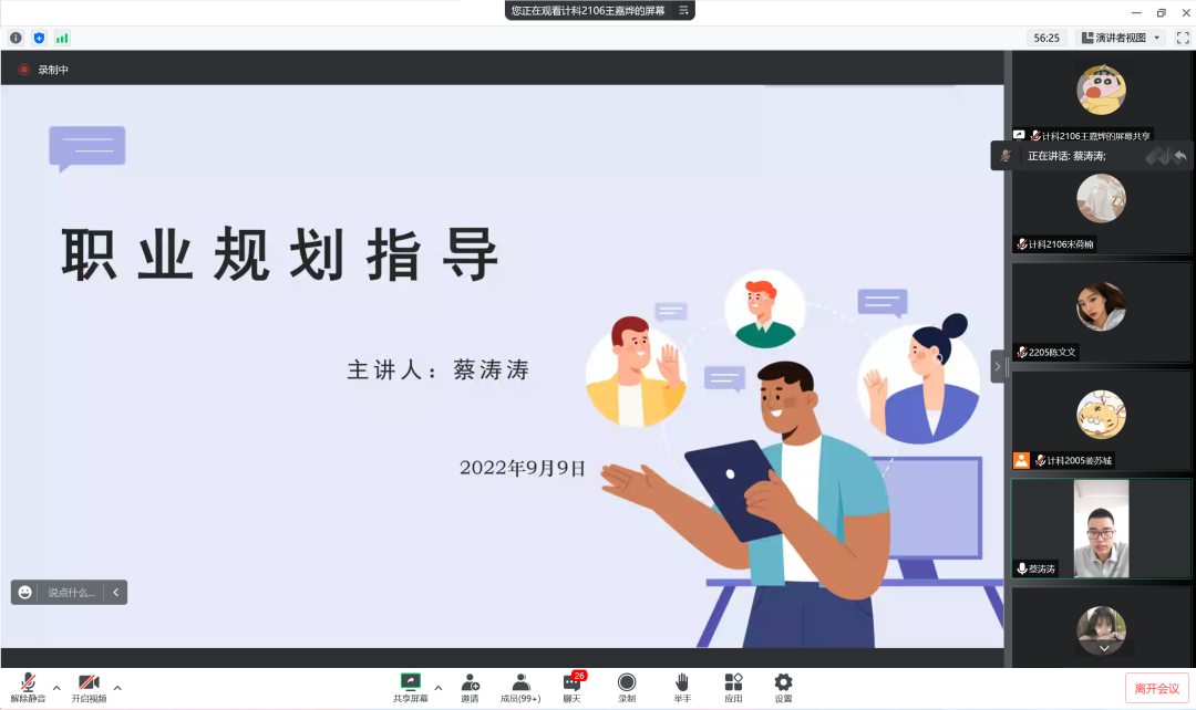 为让22级新生了解老员工职业规划的重要性,9月9日晚7点,计科公司面对2022级所有新生开展线上职业规划指导讲座,本次讲座由蔡涛涛老师主持。