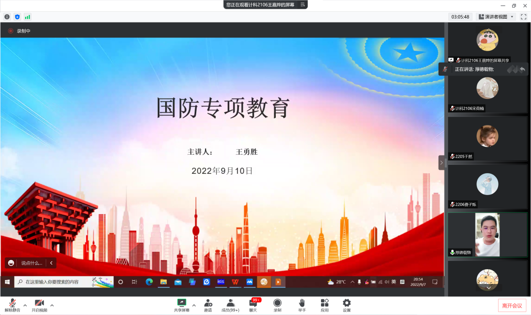 为增强22级新生的国防观念、提高国防素质,9月10日晚7点,计科公司面对2022级所有新生开展线上国防专项教育讲座,本次讲座由王勇胜老师主持。