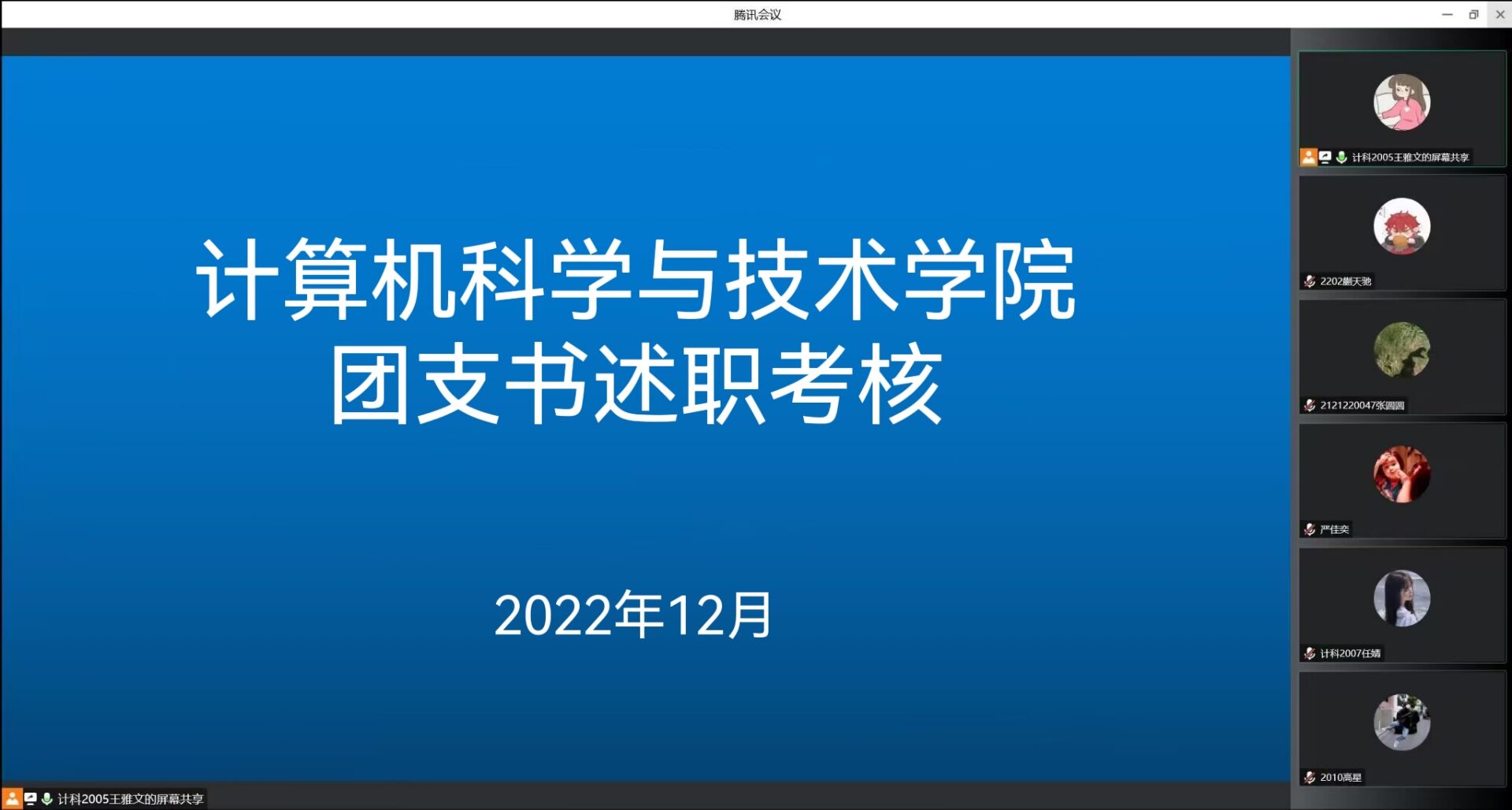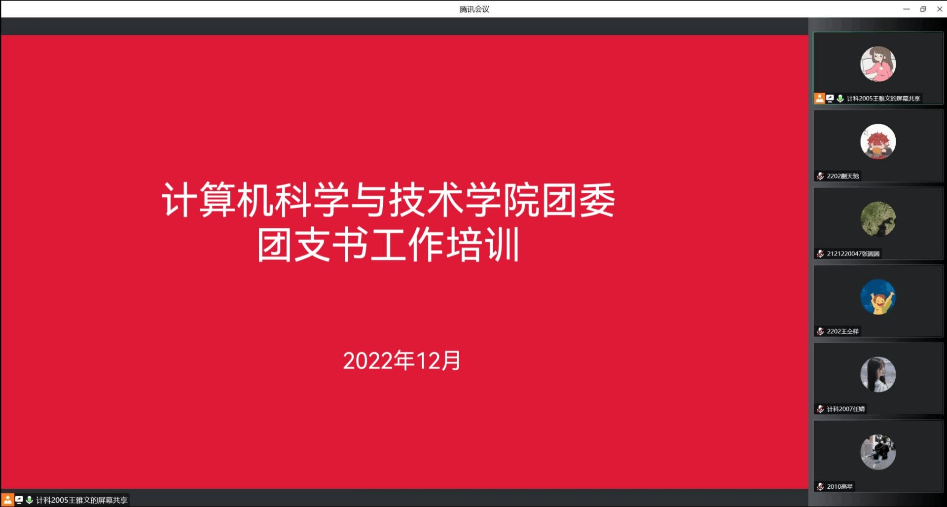 12月12日晚8点,计科公司团委副书记王雅文同学组织各班级团支部书记开展以“今年会团委相关工作培训及述职考核”为主要内容的线上会议,旨在让各位团支书清楚己任,并且鉴于本学期的工作成效,更好地完成日后的相关工作。