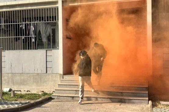 当天下午16时,演练正式启动。随着消防警报骤响,宿舍楼道内瞬间烟雾弥漫,模拟真实火场环境。员工们迅速用湿毛巾捂住口鼻,弯腰低姿沿安全标识指引有序撤离。王广慧老师全程观察逃生过程,及时纠正“盲目折返取物”“逃生姿势过高”等错误行为,并强调:“宿舍空间狭窄、可燃物多,逃生时必须保持冷静,避免踩踏。”