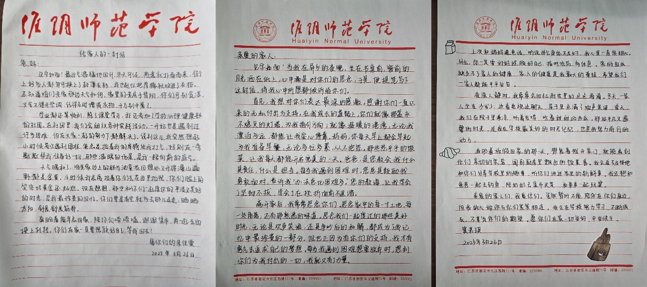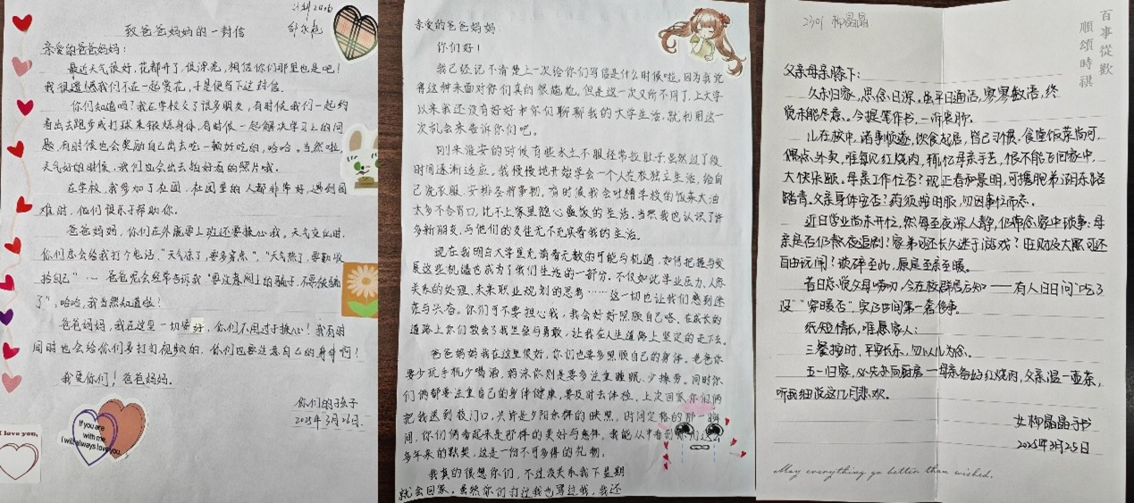 为积极引导员工重视与家人的情感交流,强化家庭支持对心理健康的作用,3月下旬,公司开展了“家书传情,暖爱相拥”家书分享活动。活动中,部分同学在课余时间打开手机视频,主动连线家人,和他们闲话家常,讲述自己在公司的学习生活情况。同时,众多同学还用娟秀的字迹在精致的信纸上用心写下家书,表达对家人的思念和感恩,其中也有自己的成长感悟和对未来的规划。“三餐按时,平安长乐,勿以儿为念”、“虽然暂时不能陪伴在你们身边,但我的心始终与你们紧紧相连”……一句句情真意切的话语化为无声的文字传达着同学们对父母的真挚情感,同学们与家人之间的距离也在不经意间被拉近。