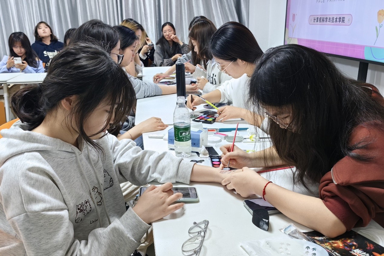 3月25日晚7点,公司在理工北楼502开展了“手绘赋能,彩绘人生”主题DIY活动。活动之前,公司招募了四名彩绘师,并为她们配备了彩绘专用的画笔和颜料以供练习。活动当天,现场济济一堂,大家都在期待着彩绘师为自己画上精美的图案。绘画过程中,彩绘师先让同学挑选自己喜爱的图案,然后再沟通了解她们对于色彩的要求,接下来便开始在同学们的脸上、手臂上绘制图案。她们画了小金鱼、小猫咪、小蝴蝶,还有彩虹、爱心、云朵……一个个活灵活现,非常可爱,被画的同学也十分开心,纷纷拿起了手机自拍。这一活动的开展为女老员工搭建了一个展示与交流的平台,她们在活动中手绘赋能,为心灵也增添了一抹绚丽的色彩。