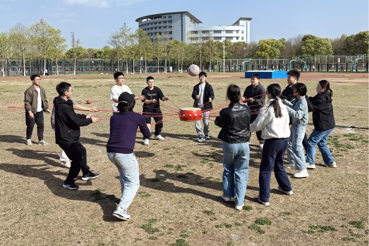 同心鼓项目考验着团队的默契与协作。十人一组,每人拉住一根连接同心鼓的绳子,共同控制鼓面的平衡与力度,使排球在鼓面上有节奏地上下跳动。活动过程中,队员们全神贯注,时刻留意着排球的动向,通过不断调整手上的力度和角度,努力让排球跳动得更久、更高。大家相互沟通、彼此配合,逐渐找到了最佳节奏,引得周围同学阵阵喝彩。