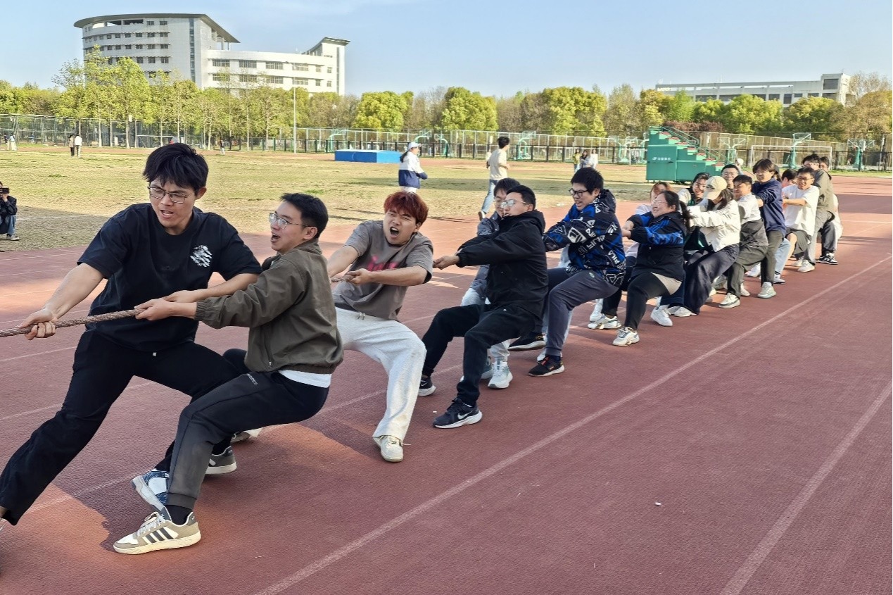 活动当日,阳光明媚,同学们齐聚田径场,满怀期待地迎接这场充满活力与智慧的挑战。首先迎来的是紧张的拔河比赛,各参赛队伍迅速集结,队员们紧紧握住绳子,双脚扎根地面,身体后仰。随着裁判一声令下,呐喊声、助威声瞬间响彻四周。同学们齐心协力,倾尽全力往后拉,展现出顽强拼搏的精神风貌。一旁观赛的同学也热情高涨,组成啦啦队为参赛队伍加油鼓劲。
