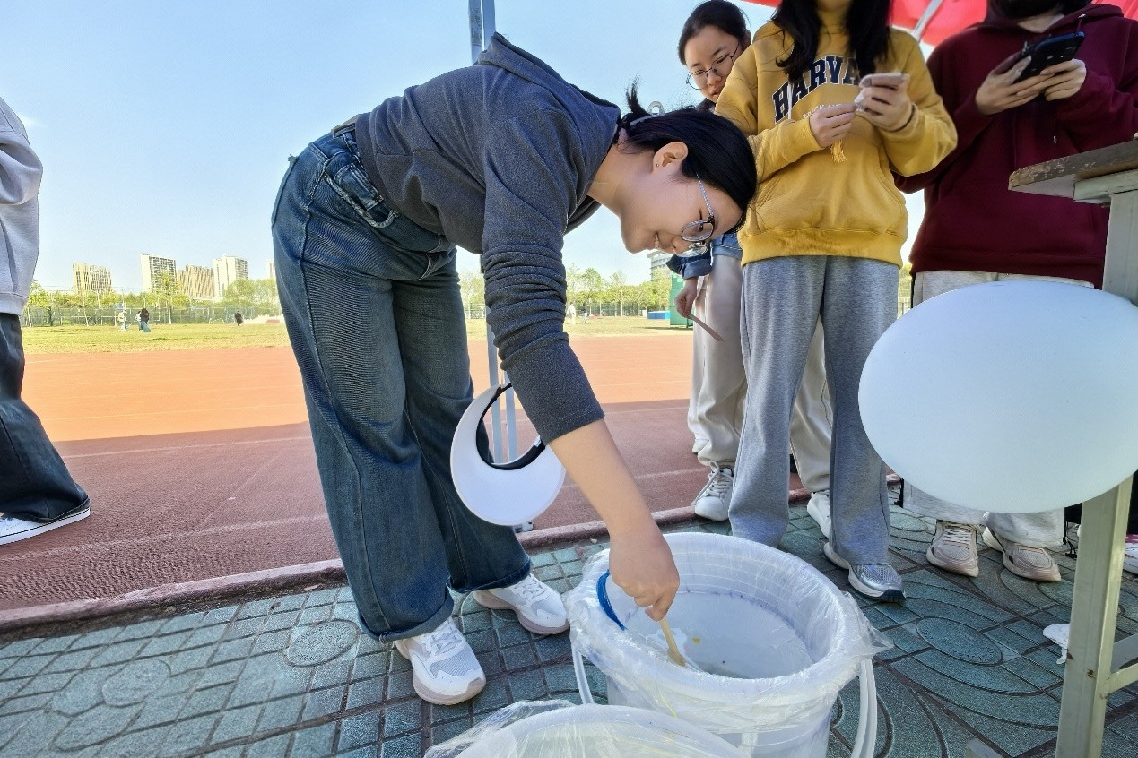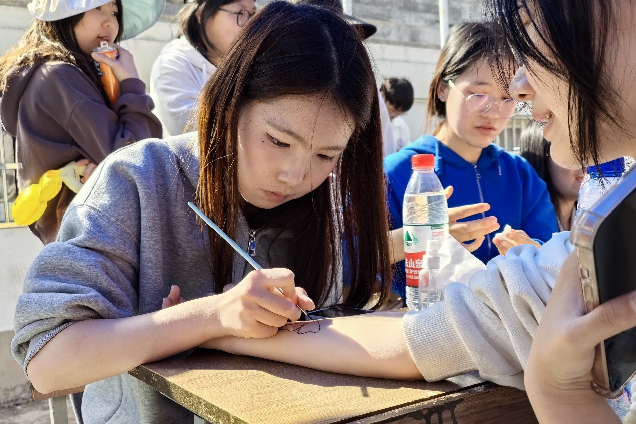 除了各类竞技项目,现场还设置了丰富多样的趣味活动区域。在面部彩绘区,同学们充分发挥创意,用五彩的颜料在脸上、手臂上绘制出精美的图案,展示出独特的个性与青春活力。漆扇区弥漫着浓厚的艺术气息,同学们将空白扇子浸入滴有颜料的水中,任意摇晃旋转,出水的瞬间,原本空白的扇子上就呈现出了精美的图案。硬纸板插花区域也吸引了众多同学驻足,大家巧妙地利用硬纸板和鲜花,发挥想象力,创作出一个个别具一格的插花作品。在草坪上,同学们还放起了风筝,风筝在微风的助力下缓缓升空,在蓝天中翩翩起舞,时而高飞,时而低旋,仿佛在与风儿嬉戏,奏响了一曲欢快的春日颂歌。