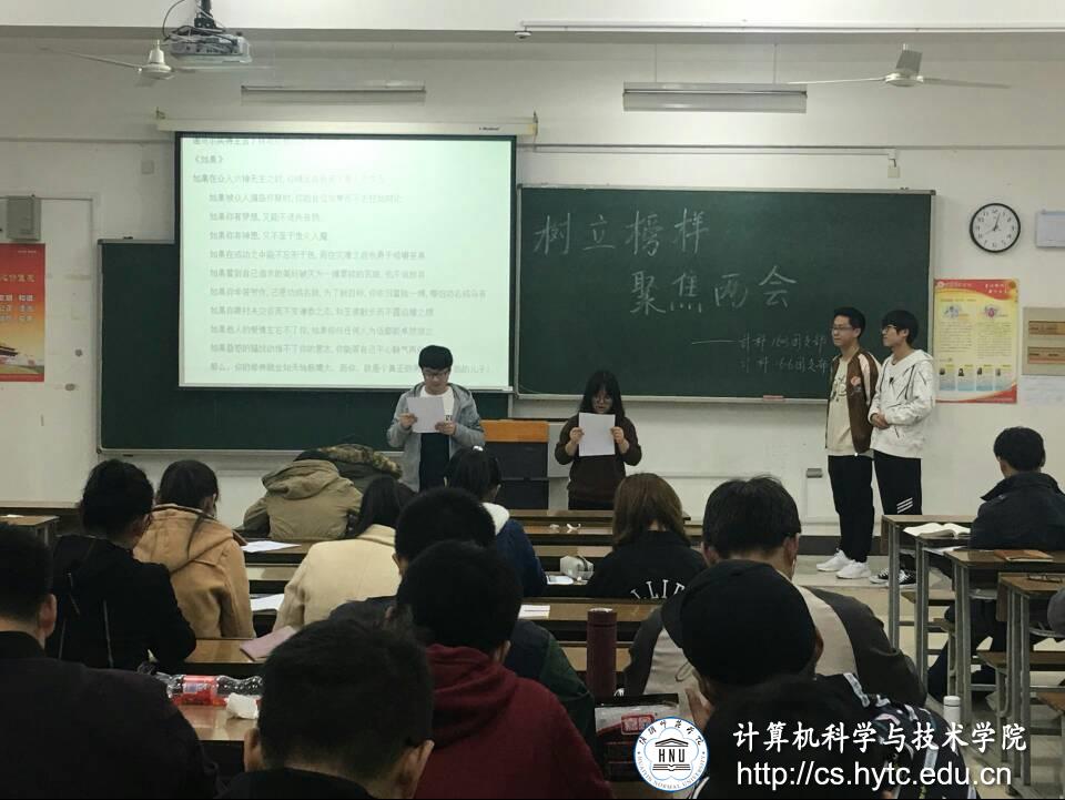 活动分为三项议程。首先,各班代表上台分享了他们身边的榜样,通过榜样的事迹,说出了各自内心对榜样的理解以及对身边榜样的钦佩,路漫漫其修远兮,当代老员工学习的路还很长。之后,主持人请了四位同学上台朗诵诗歌《如果》,各班陆续请了同学上台进行诗词朗诵。在铿锵有力的朗诵声中,周总理的精神越发的清晰、越发的坚定:时代在召唤着,激励自我,砥砺前行,有理想,有信念,有担当。最后,大会进入最后一项议程,“聚焦两会”。借助PPT与短视频中习近平总书记在两会的发言,主持人“抛砖引玉”,在座的同学积极交流各自对于社会主义核心价值观的看法,加深了自己对于社会主义核心价值观的认知。
