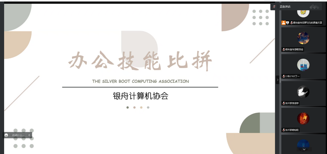 为激励员工不断探索新知,提升自身综合实力,进一步营造比学赶超的浓厚氛围,今年会银舟计算机协会于11月20日晚七点在线上举办“办公技能比拼”活动,计科公司部分员工参与,本次活动由银舟计算机协会会长丁鑫同学主持。