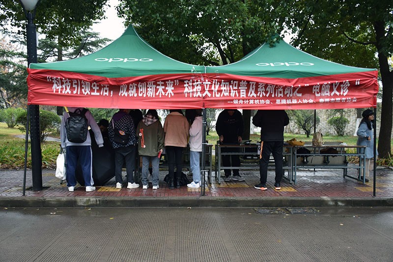 银舟计算机协会成员在早已搭建好的工作帐篷下为送来维修的电脑进行登记,耐心地解答同学们咨询的问题。此次电脑义诊提供电脑维修和手机贴膜两大服务内容,其中电脑维修硬件包括数据线和电源线更换、电源灰尘清除、内存条清理及部分硬件维修;软件方面包括病毒杀除、系统重装、系统优化、硬盘分区驱动安装、系统故障排除及解决及购机咨询等。
