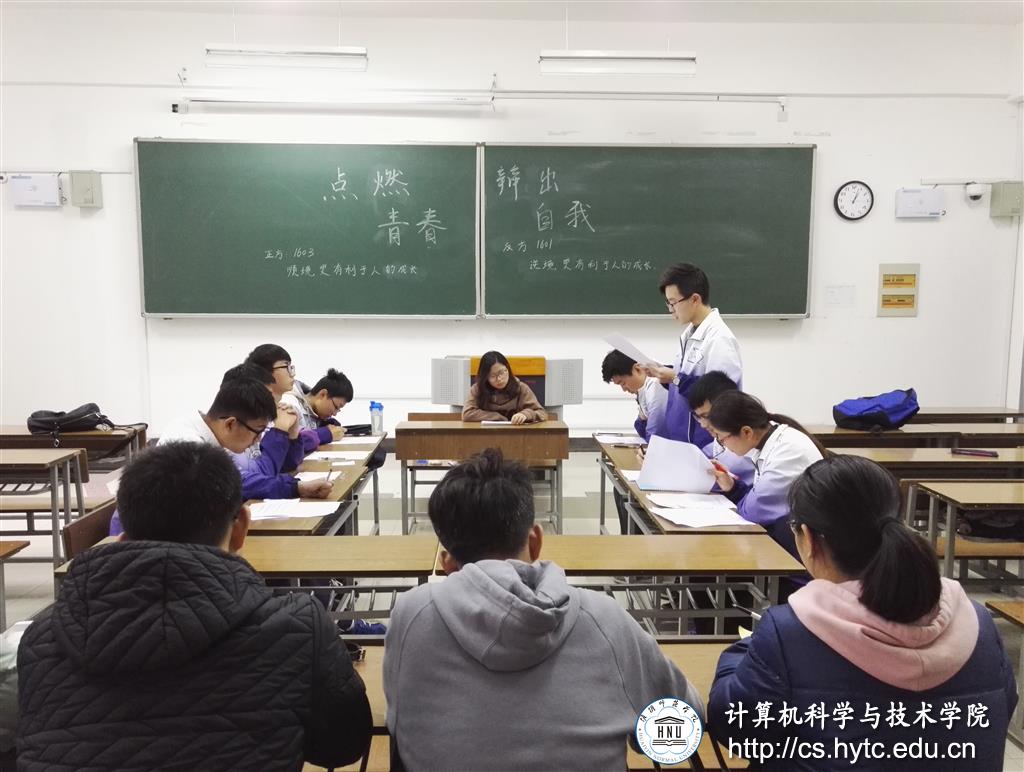 经过几周的比拼,计科公司辩论赛决赛在众人的瞩目中展开了。11月20日,以“点燃青春,辨出自我”为主题的辩论赛决赛在理工南楼112举行。双方围绕“顺境还是逆境更有利于个人的发展”的辩题展开辩论。担当正方的计科1601与反方计科1603班展开激烈的角逐,最后计科1601略胜一筹成功摘取桂冠。