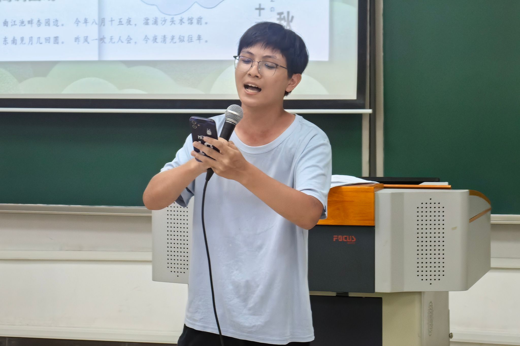 走进任何一个班级的活动现场,映入眼帘的都是同学们精心布置的场景:红彤彤的灯笼高高挂起,五颜六色的彩带迎风飞舞,香甜可口的月饼摆满课桌……小小的一方教室展现出了浓厚的节日氛围。活动开始,灯光渐暗,音乐缓缓响起,一个个精彩的节目相继登台,同学们有的跳起舞蹈,有的演唱歌曲,有的表演小品,还有的演奏乐器,节目形式多样、趣味十足,充分展现了同学们的多才多艺和青春活力。2402班的同学们发挥了自己的慧心巧思,动手制作了各式各样的中秋饰品,有灯笼、竹编画等等,精巧又有创意。2404班的活动现场变成了一个文艺汇演的舞台,同学们表演了朗诵、街舞、合唱等多种多样的节目,还举行了猜灯谜、赏月等活动。同学们互相分享着自己家乡关于中秋、关于月亮的故事,用声音传递着情感,拉近了彼此之间的距离。此外,各班级的班主任老师也参与其中,师生同乐的画面更让同学们消除了远在家乡的孤寂之感,在校园里也感受到了如家般的温暖。
