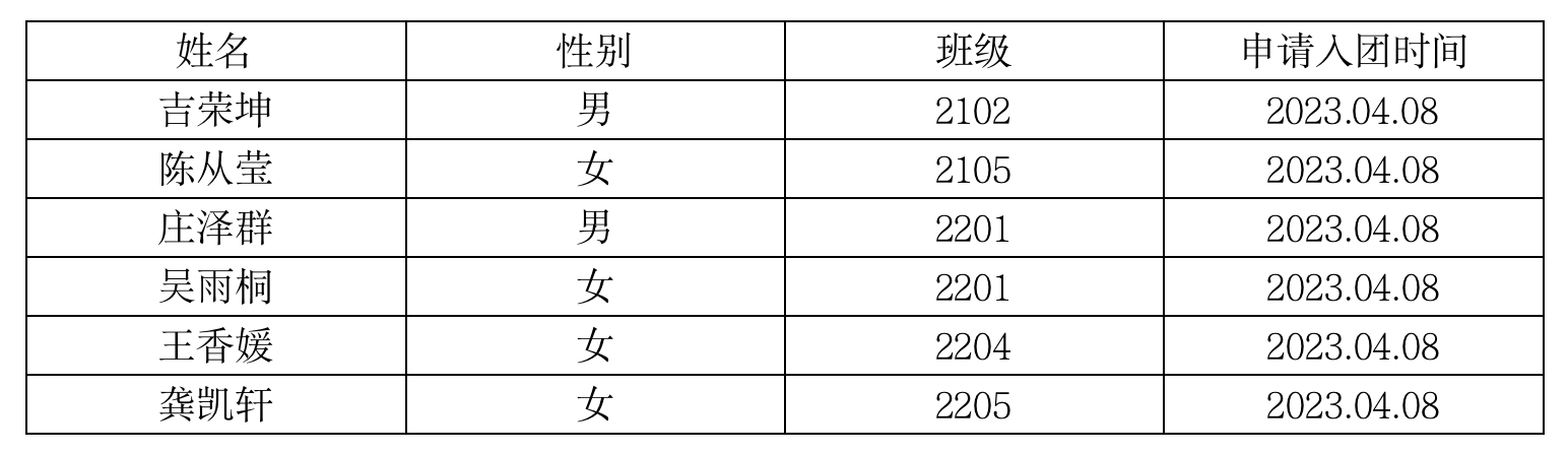 由员工自愿申请,各班级团支部考察推荐,院团委拟定吉荣坤、陈从莹、庄泽群、吴雨桐、王香媛、龚凯轩六位同学为2023年新入团成员,现予以公示。