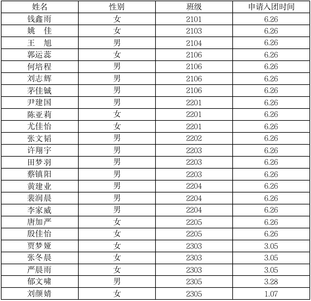 由员工自愿申请,各班级团支部考察推荐,院团委拟钱鑫雨、姚佳、王旭、郭运蕊、何培程、刘志辉、茅佳铖等同学为2023年共青团员发展对象,现予以公示。