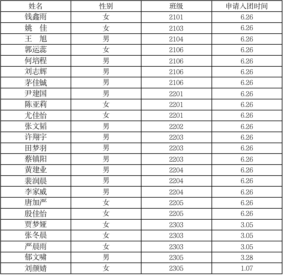 由员工自愿申请,各班级团支部考察推荐,院团委拟定钱鑫雨、姚佳、王旭、郭运蕊、何培程、刘志辉、茅佳铖等同学为2023年新入团成员,现予以公示。