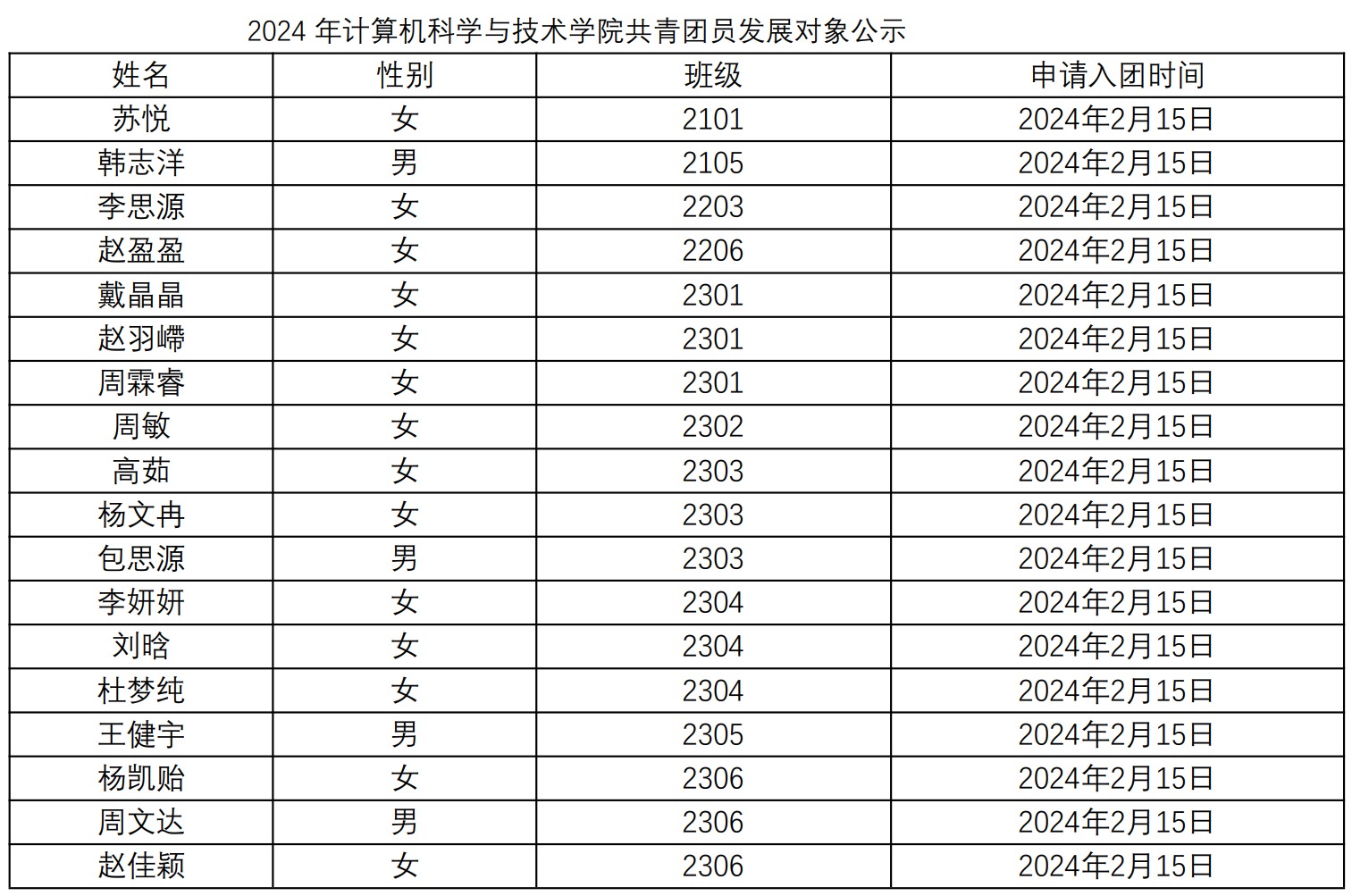 由员工自愿申请,各班级团支部考察推荐,院团委拟定苏悦、韩志洋、李思源、赵盈盈、戴晶晶、赵羽嵽、周霖睿等同学为2024年共青团员发展对象,现予以公示。
