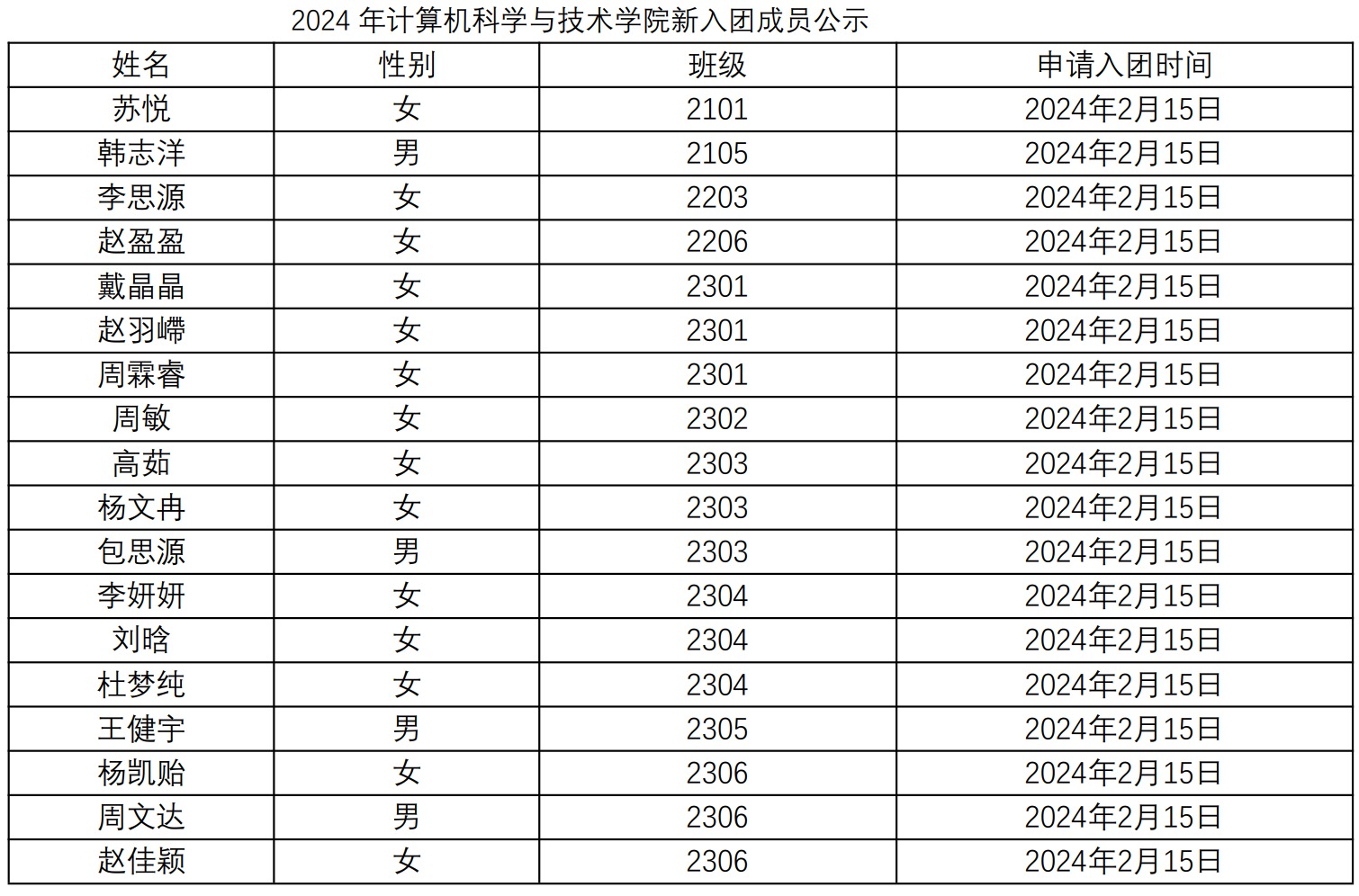 由员工自愿申请,各班级团支部考察推荐,院团委拟定苏悦、韩志洋、李思源、赵盈盈、戴晶晶、赵羽嵽、周霖睿等同学为2024年新入团成员,现予以公示。