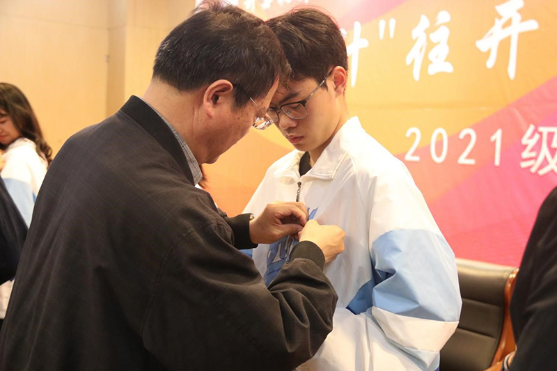 会上,院领导和系主任还为新生代表佩戴校徽并颁发他们赠予新生的四字警言。