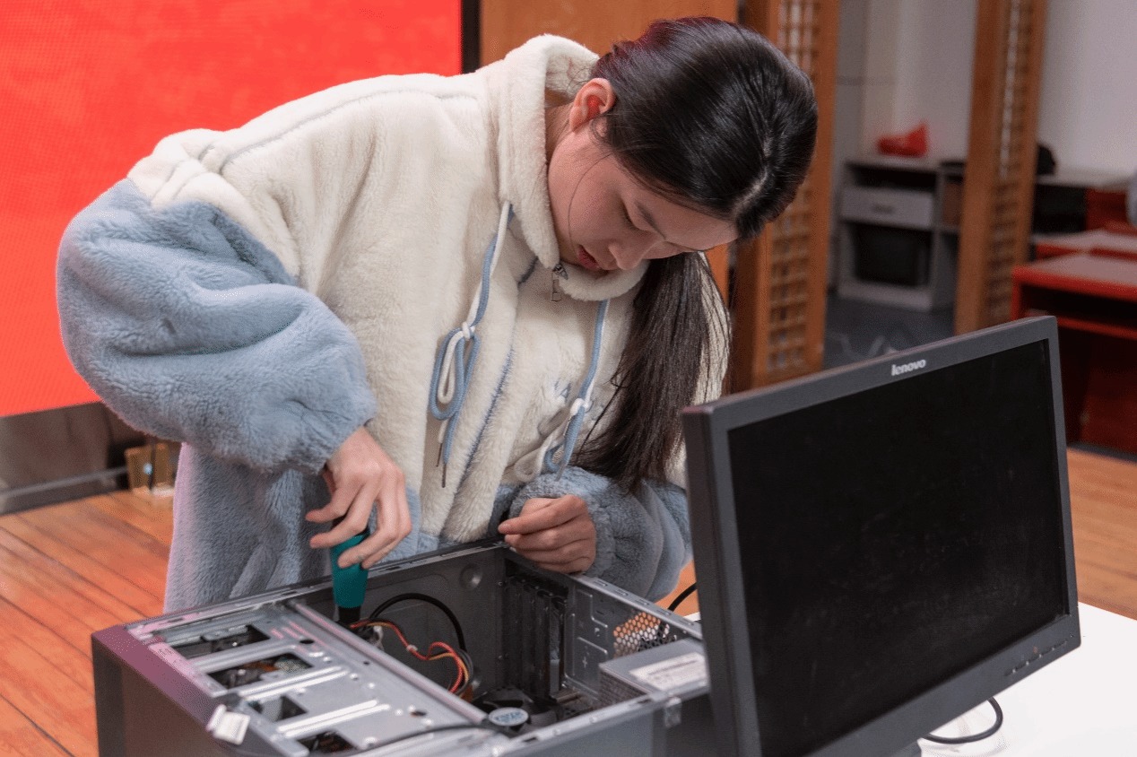 随后,一场紧张激烈的计算机组装大赛拉开了专业素养大赛的序幕。晁毓奇、赵雅婷和何振龙三位同学在主席台上展现了他们娴熟的计算机组装技术。他们充分发挥平时所学,时而手持螺丝刀,时而触摸各种硬件,力争在最短的时间内把眼前的主机重组。经过激烈的角逐,最终何振龙同学率先完成了计算机重组,获得了第一名。