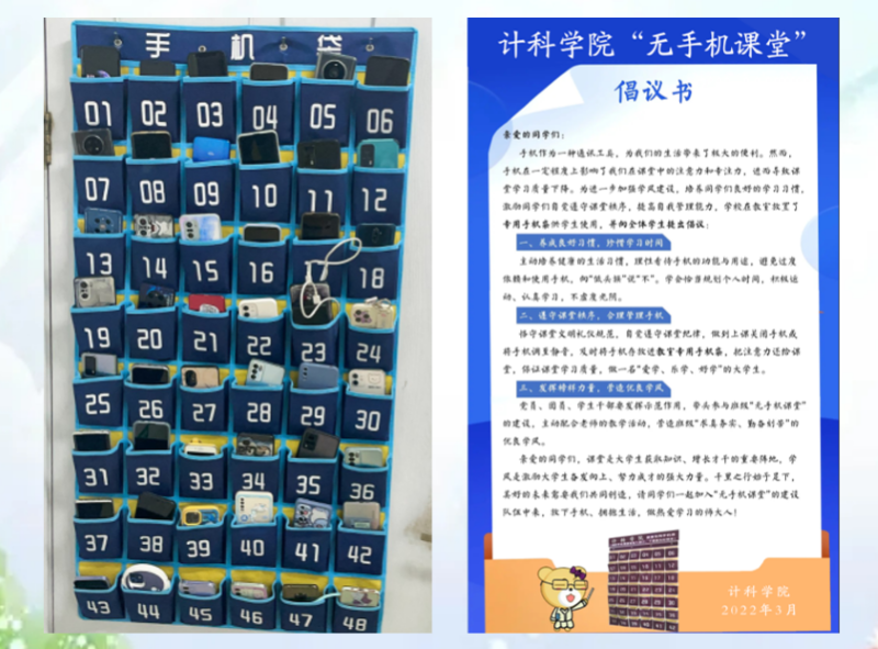 图为计科公司课堂手机袋和“无手机课堂”倡议书。