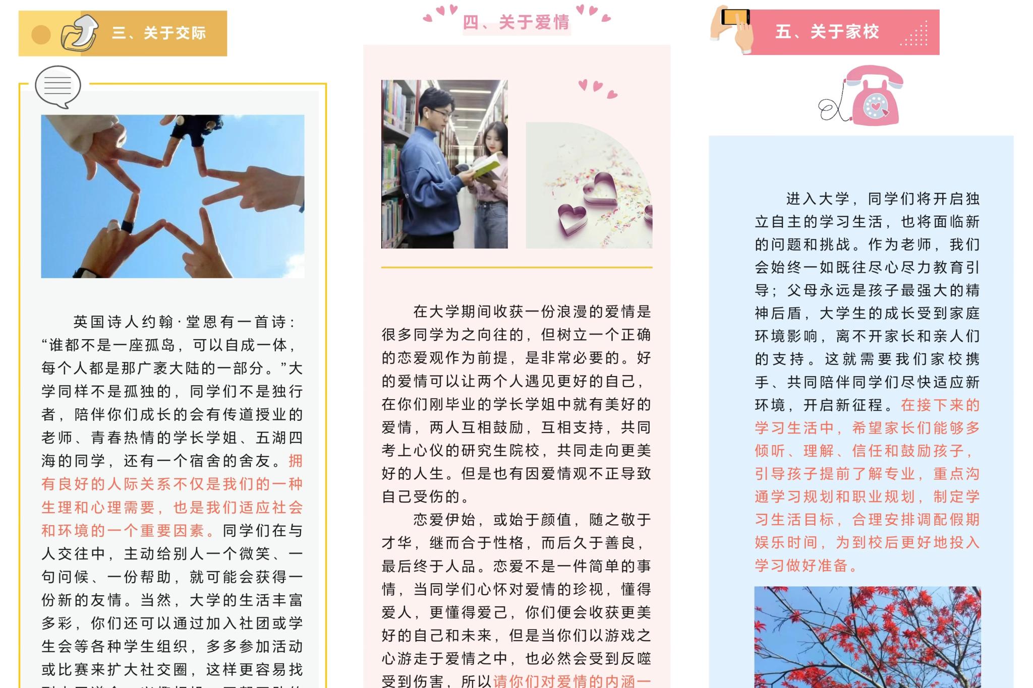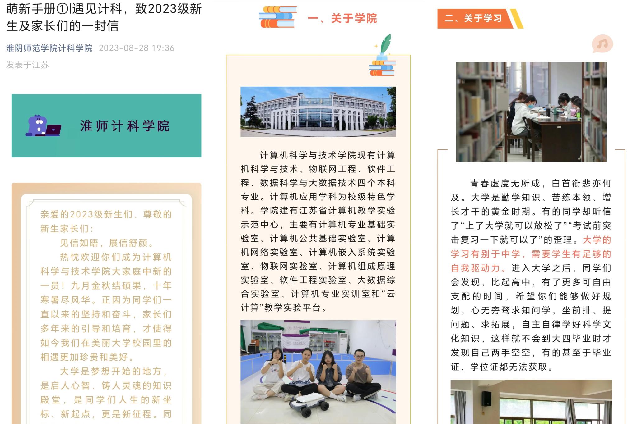 新生入校前,公司微信公众平台精心策划了“萌新手册”栏目,围绕公司概况、专业设置、团队力量、学科竞赛团队介绍、员工安全教育、学业指导、人际交往等方面进行推送,帮助新生提前了解进入大学必须知道的各项事宜。在栏目首期,公司推出了一篇《致2023级新生及家长们的一封信》,对即将到来的新生表示期盼和欢迎。书信为新生和家长介绍了公司的基本情况,并从学习、交际、恋爱等方面给新生做出了指导和提醒,最后期盼家校合力,希望新生家长能够在新生顺利适应老员工活、学习等方面给予支持、配合帮助。